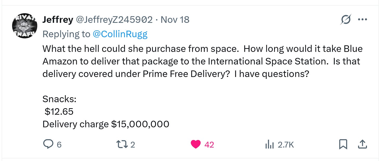There are things about the story that don’t make sense. Why does Anne McClain need money while she is stationed at the International Space Station? Are there vending machines in space? Is this how they feed astronauts now? 🤔