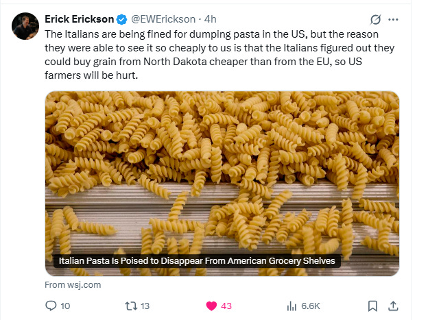 Eataly runs many tourist cooking classes in Roma, and pasta in Italy is cheaper than in the US. But American companies using the government to limit competition? Mamma Mia! A person close to Investindustrial said it plays no role in drafting antidumping complaints. I note that they didn’t rule out “voice to text”. Erick Erickson tweeted that a large amount of flour for Italian pasta comes from North Dakota because it is cheaper flour. I think this means the government will have to provide a bailout to farmers, to be paid out of the tariffs on the pasta made by firms in Italy who imported North Dakota flour.
