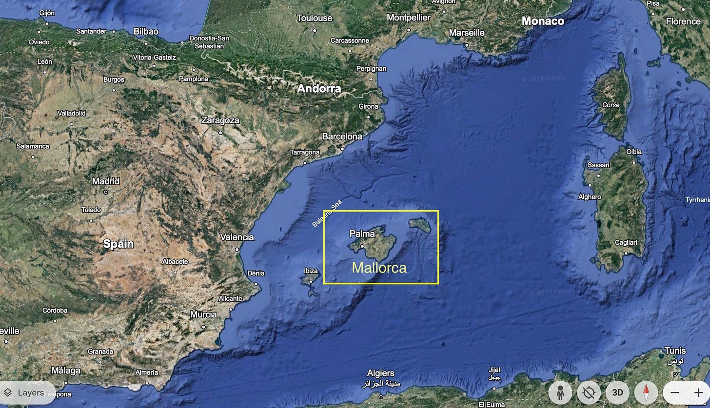 At any rate, humans 6000 years ago were not known to have settled on Mallorca, which one article noted is the sixth largest island in the Med. Here’s a picture of where the islands are situated, via a screen grab from Google Earth, marked and labeled by your bleary-eyed correspondent.
